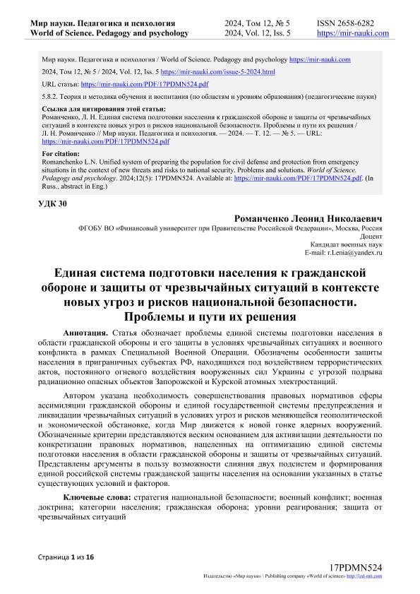 Романченко, Л.Н. Единая система подготовки населения к гражданской обороне и защиты от чрезвычайных ситуаций в контексте новых угроз и рисков национальной безопасности. Проблемы и пути их решения. — Текст: электронный // Мир науки. Педагогика и психология. – 2024. – № 5. — URL: https://mir-nauki.com/PDF/17PDMN524.pdf (дата обращения: 28.08.2025) — <URL:http://elib.fa.ru/art2024/bv3833.pdf>.
