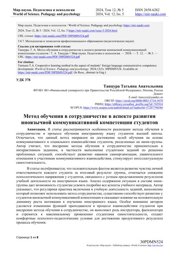 Танцура, Т.А. Метод обучения в сотрудничестве в аспекте развития иноязычной коммуникативной компетенции студентов. — Текст: электронный // Мир науки. Педагогика и психология. – 2024. – № 5. — URL: https://mir-nauki.com/PDF/30PDMN524.pdf (дата обращения: 28.08.2025) — <URL:http://elib.fa.ru/art2024/bv3842.pdf>.