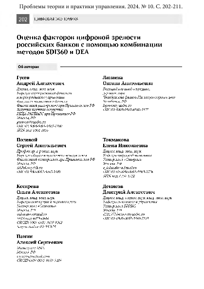 Оценка факторов цифровой зрелости российских банков с помощью комбинации методов SDI360 и DEA / А.А. Гусев, С.А. Полевой, О.А. Косарева [и др.] // Проблемы теории и практики управления. – 2024. – № 10. — С. 202-211. — Только в электронном виде. — <URL:http://elib.fa.ru/art2024/bv3888.pdf>.