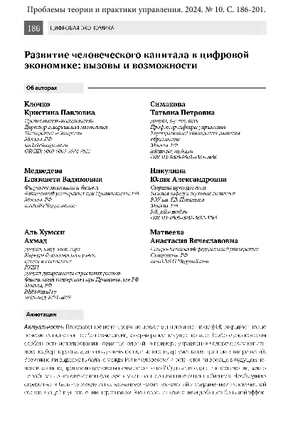 Развитие человеческого капитала в цифровой экономике: вызовы и возможности / К.П. Клочко, Е.В. Медведева, А. Аль Хумсси [и др.] // Проблемы теории и практики управления. – 2024. – № 10. — С. 186-201. — Только в электронном виде. — <URL:http://elib.fa.ru/art2024/bv3897.pdf>.
