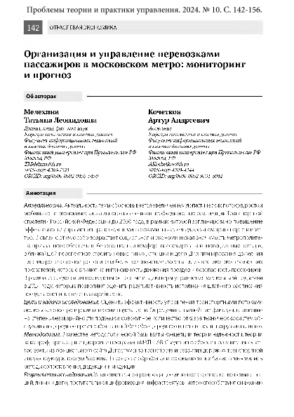 Мелехина, Т.Л. Организация и управление перевозками пассажиров в московском метро: мониторинг и прогноз / Т.Л. Мелехина, А.А. Кочетков // Проблемы теории и практики управления. – 2024. – № 10. — С. 142-156. — Только в электронном виде. — <URL:http://elib.fa.ru/art2024/bv3901.pdf>.