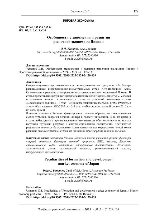 Усманов, Д.И. Особенности становления и развития рыночной экономики Японии // Проблемы рыночной экономики. – 2024. – № 3. — С. 129-139. — Только в электронном виде. — <URL:http://elib.fa.ru/art2024/bv3913.pdf>.