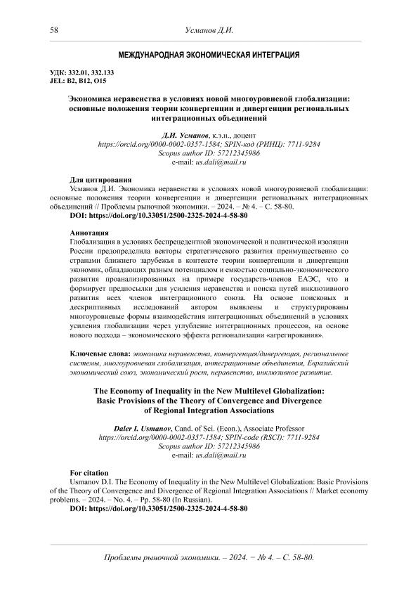 Усманов, Д.И. Экономика неравенства в условиях новой многоуровневой глобализации: основные положения теории конвергенции и дивергенции региональных интеграционных объединений // Проблемы рыночной экономики. – 2024. – № 4. — С. 58-80. — Только в электронном виде. — <URL:http://elib.fa.ru/art2024/bv3914.pdf>.