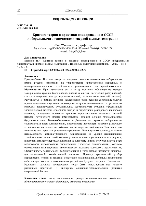 Шапкин, И.Н. Критика теории и практики планирования в СССР
