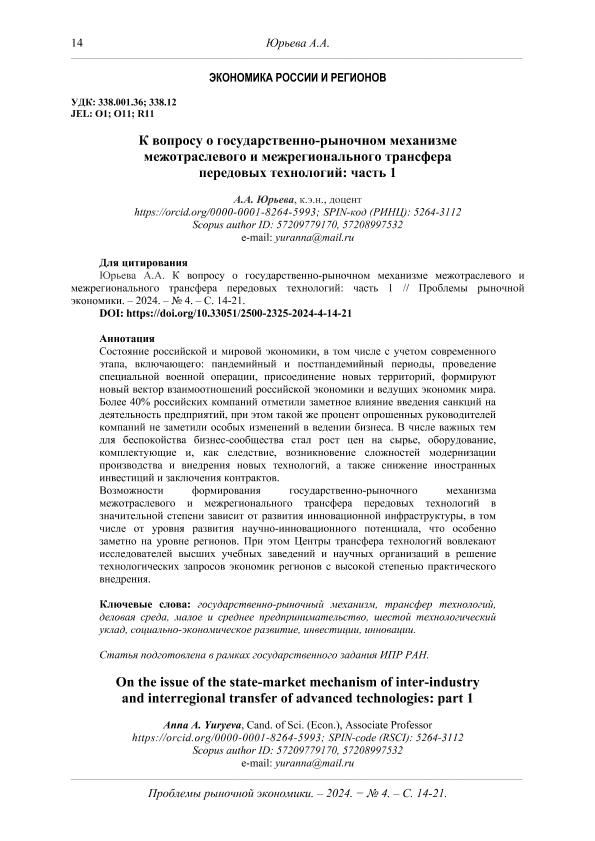 Юрьева, А.А. К вопросу о государственно-рыночном механизме межотраслевого и межрегионального трансфера передовых технологий. Ч. 1 // Проблемы рыночной экономики. – 2024. – № 4. — С. 14-21. — Только в электронном виде. — <URL:http://elib.fa.ru/art2024/bv3916.pdf>.