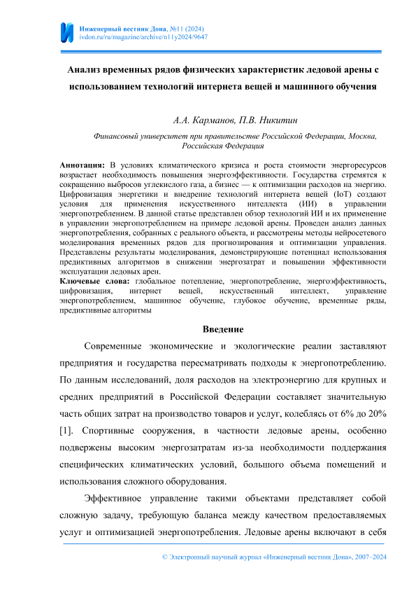Карманов, А.А. Анализ временных рядов физических характеристик ледовой арены с использованием технологий интернета вещей и машинного обучения / А.А. Карманов, П.В. Никитин. — Текст: электронный // Инженерный вестник Дона. – 2024. – № 11. - URL: http://ivdon.ru/ru/magazine/archive/n11y2024/9647. - Дата публикации: 30.11.2024 — <URL:http://elib.fa.ru/art2024/bv3602.pdf>.