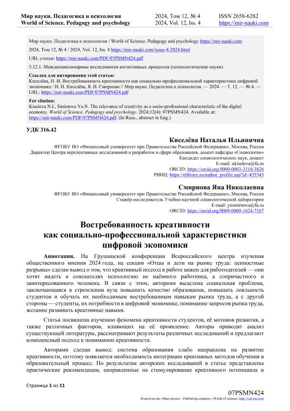 Киселева, Н.И. Востребованность креативности как социально-профессиональной характеристики цифровой экономики / Н.И. Киселева, Я.Н. Смирнова. — Текст: электронный // Мир науки. Педагогика и психология. – 2024. – № 4. — URL: https://mir-nauki.com/PDF/07PSMN424.pdf (дата обращения: 28.08.2025) — <URL:http://elib.fa.ru/art2024/bv3707.pdf>.
