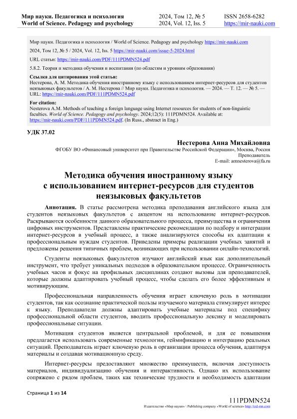 Нестерова, А.М. Методика обучения иностранному языку с использованием интернет-ресурсов для студентов неязыковых факультетов. — Текст: электронный // Мир науки. Педагогика и психология. – 2024. – № 5. — URL: https://mir-nauki.com/PDF/111PDMN524.pdf (дата обращения: 28.08.2025) — <URL:http://elib.fa.ru/art2024/bv3712.pdf>.