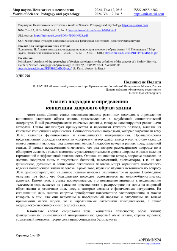 Полишкене, Й. Анализ подходов к определению концепции здорового образа жизни. — Текст: электронный // Мир науки. Педагогика и психология. – 2024. – № 5. — URL: https://mir-nauki.com/PDF/49PDMN524.pdf (дата обращения: 28.08.2025) — <URL:http://elib.fa.ru/art2024/bv3719.pdf>.
