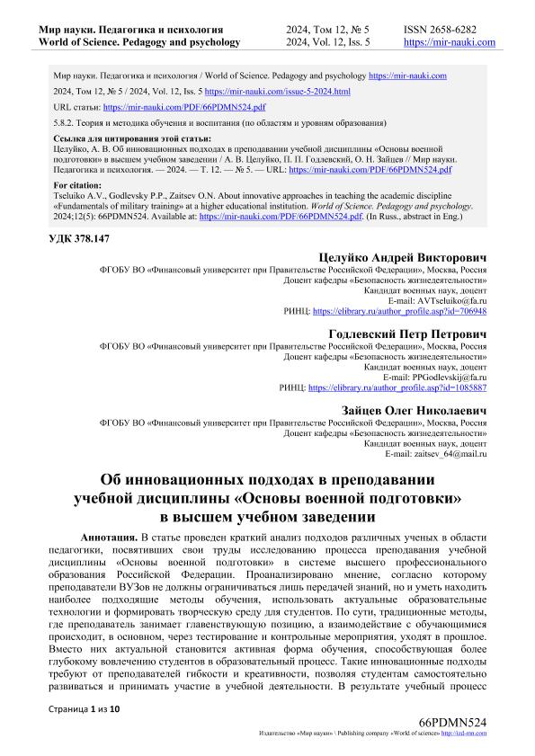 Целуйко, А.В. Об инновационных подходах в преподавании учебной дисциплины «Основы военной подготовки» в высшем учебном заведении / А.В. Целуйко, П.П. Годлевский, О.Н. Зайцев. — Текст: электронный // Мир науки. Педагогика и психология. – 2024. – № 5. — URL: https://mir-nauki.com/PDF/66PDMN524.pdf (дата обращения: 28.08.2025) — <URL:http://elib.fa.ru/art2024/bv3726.pdf>.