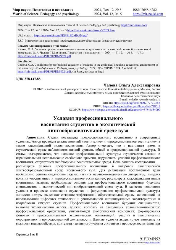Чалова, О.А. Условия профессионального воспитания студентов в экологической лингообразовательной среде вуза. — Текст: электронный // Мир науки. Педагогика и психология. – 2024. – № 5. — URL: https://mir-nauki.com/PDF/91PDMN524.pdf (дата обращения: 28.08.2025) — <URL:http://elib.fa.ru/art2024/bv3728.pdf>.