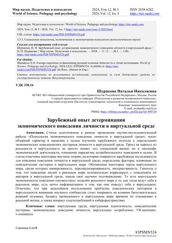 Шуракова, Н.Н. Зарубежный опыт детерминации экономического поведения личности в виртуальной среде. — Текст: электронный // Мир науки. Педагогика и психология. – 2024. – № 5. — URL: https://mir-nauki.com/PDF/83PSMN524.pdf (дата обращения: 28.08.2025) — <URL:http://elib.fa.ru/art2024/bv3730.pdf>.