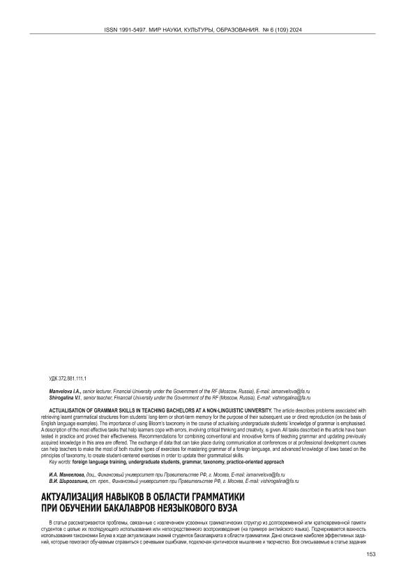 Манвелова, И.А. Актуализация навыков в области грамматики при обучении бакалавров неязыкового вуза / И.А. Манвелова, В.И. Широгалина // Мир Науки, Культуры, Образования. – 2024. – № 6. — С. 153-156. — Только в электронном виде. — <URL:http://elib.fa.ru/art2024/bv3711.pdf>.