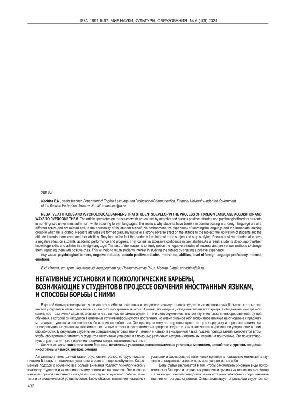 Нечина, Е.Н. Негативные установки и психологические барьеры, возникающие у студентов в процессе обучения иностранным языкам, и способы борьбы с ними // Мир Науки, Культуры, Образования. – 2024. – № 6. — С. 432-434. — Только в электронном виде. — <URL:http://elib.fa.ru/art2024/bv3714.pdf>.