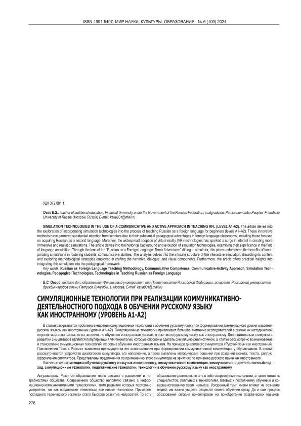 Овсий, Е.С. Симуляционные технологии при реализации коммуникативно-деятельностного подхода в обучении русскому языку как иностранному (уровень А1-А2) // Мир Науки, Культуры, Образования. – 2024. – № 6. — С. 276-279. — Только в электронном виде. — <URL:http://elib.fa.ru/art2024/bv3715.pdf>.