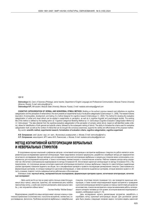 Островская, И.В. Метод когнитивной категоризации вербальных и невербальных стимулов / И.В. Островская, Н.П. Островская // Мир Науки, Культуры, Образования. – 2024. – № 6. — С. 625-627. — Только в электронном виде. — <URL:http://elib.fa.ru/art2024/bv3716.pdf>.