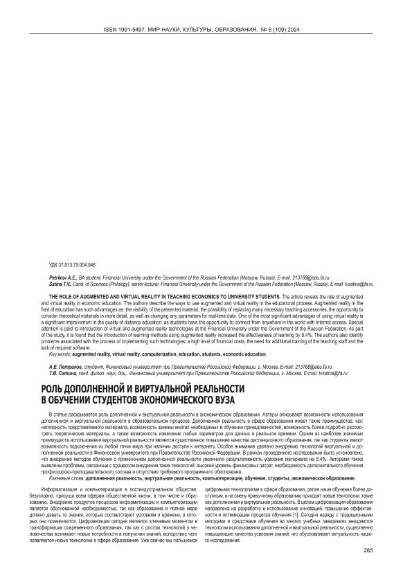 Петриков, А.Е. Роль дополненной и виртуальной реальности в обучении студентов экономического вуза / А.Е. Петриков, Т.В. Сатина // Мир Науки, Культуры, Образования. – 2024. – № 6. — С. 285-287. — Только в электронном виде. — <URL:http://elib.fa.ru/art2024/bv3717.pdf>.