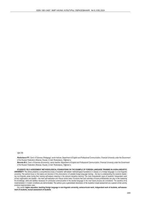 Ростовцева, П.П. Методические основы самооценки студентов на примере иноязычной подготовки в неязыковом вузе / П.П. Ростовцева, М.В. Боровко // Мир Науки, Культуры, Образования. – 2024. – № 6. — С. 249-252. — Только в электронном виде. — <URL:http://elib.fa.ru/art2024/bv3720.pdf>.
