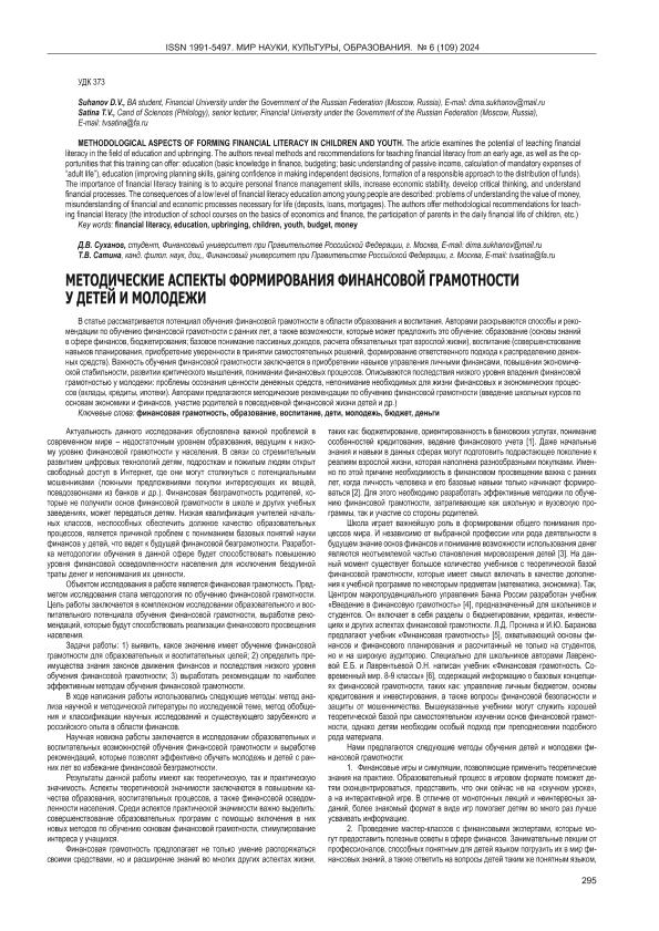 Суханов, Д.В. Методические аспекты формирования финансовой грамотности у детей и молодежи / Д.В. Суханов, Т.В. Сатина // Мир Науки, Культуры, Образования. – 2024. – № 6. — С. 295-296. — Только в электронном виде. — <URL:http://elib.fa.ru/art2024/bv3723.pdf>.