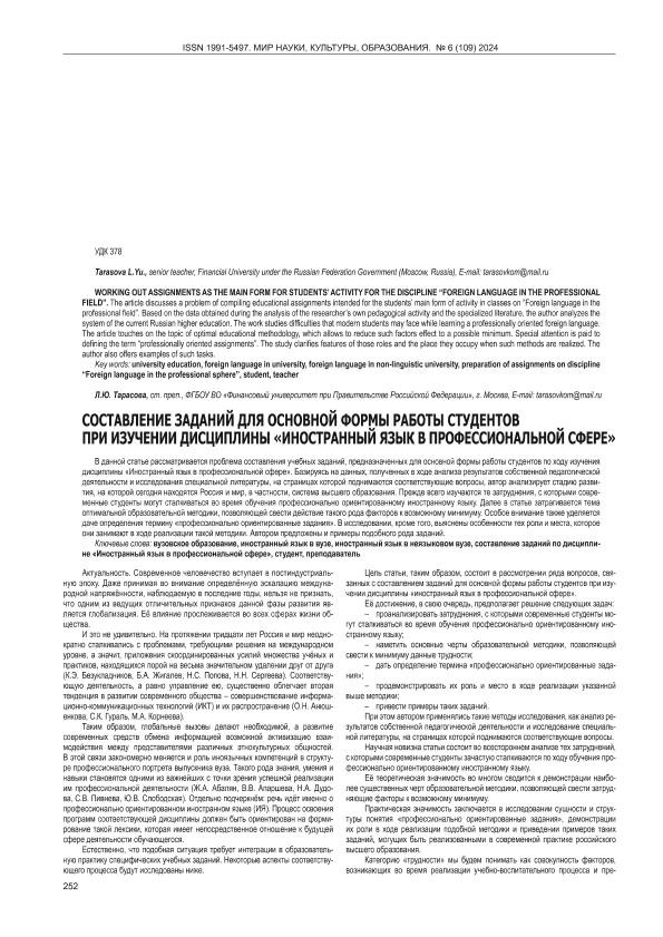 Тарасова, Л.Ю. Составление заданий для основной формы работы студентов при изучении дисциплины «иностранный язык в профессиональной сфере» // Мир Науки, Культуры, Образования. – 2024. – № 6. — С. 252-254. — Только в электронном виде. — <URL:http://elib.fa.ru/art2024/bv3724.pdf>.