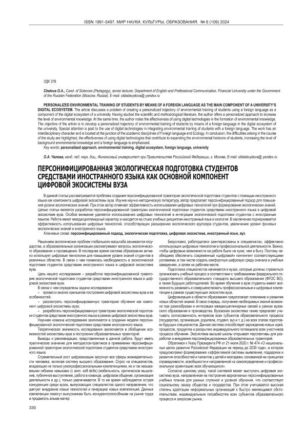 Чалова, О.А. Персонифицированная экологическая подготовка студентов средствами иностранного языка как основной компонент цифровой экосистемы вуза // Мир Науки, Культуры, Образования. – 2024. – № 6. — С. 330-332. — Только в электронном виде. — <URL:http://elib.fa.ru/art2024/bv3727.pdf>.