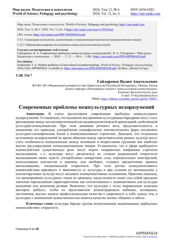 Гайдаренко, В.А. Современные проблемы межкультурных недоразумений. — Текст: электронный // Мир науки. Педагогика и психология. – 2024. – № 6. — URL: https://mir-nauki.com/PDF/69PSMN624.pdf (дата обращения: 21.08.2025) — <URL:http://elib.fa.ru/art2024/bv3794.pdf>.