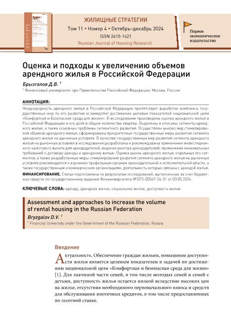 Брызгалов, Д.В. Оценка и подходы к увеличению объемов арендного жилья в Российской Федерации // Жилищные стратегии. – 2024. – № 4. — С. 549-562. — Только в электронном виде. — <URL:http://elib.fa.ru/art2024/bv3590.pdf>.
