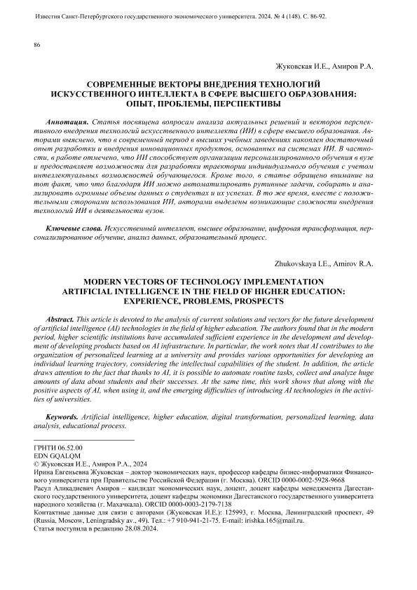 Жуковская, И.Е. Современные векторы внедрения технологий искусственного интеллекта в сфере высшего образования: опыт, проблемы, перспективы / И.Е. Жуковская, Р.А. Амиров // Известия Санкт-Петербургского государственного экономического университета. – 2024. – № 4. — С. 86-92. — Только в электронном виде. — <URL:http://elib.fa.ru/art2024/bv3598.pdf>.