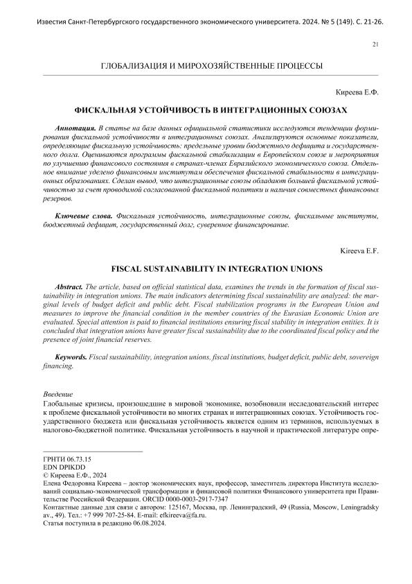 Киреева, Е.Ф. Фискальная устойчивость в интеграционных союзах // Известия Санкт-Петербургского государственного экономического университета. – 2024. – № 5. — С. 21-26. — Только в электронном виде. — <URL:http://elib.fa.ru/art2024/bv3604.pdf>.