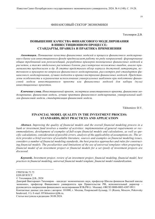 Тихомиров, Д.В. Повышение качества финансового моделирования в инвестиционном процессе: стандарты, правила и практика применения // Известия Санкт-Петербургского государственного экономического университета. – 2024. – № 4. — С. 19-28. — Только в электронном виде. — <URL:http://elib.fa.ru/art2024/bv3624.pdf>.