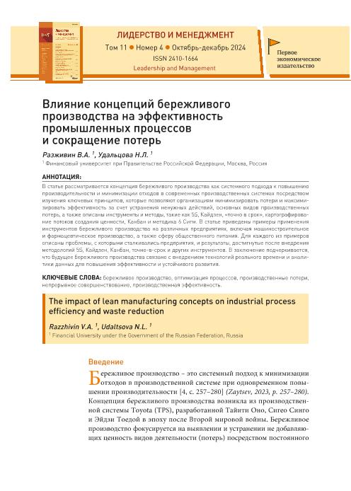 Разживин, В.А. Влияние концепций бережливого производства на эффективность промышленных процессов и сокращение потерь / В.А. Разживин, Н.Л. Удальцова // Лидерство и менеджмент. – 2024. – № 4. — С. 1405-1418. — Только в электронном виде. — <URL:http://elib.fa.ru/art2024/bv3669.pdf>.