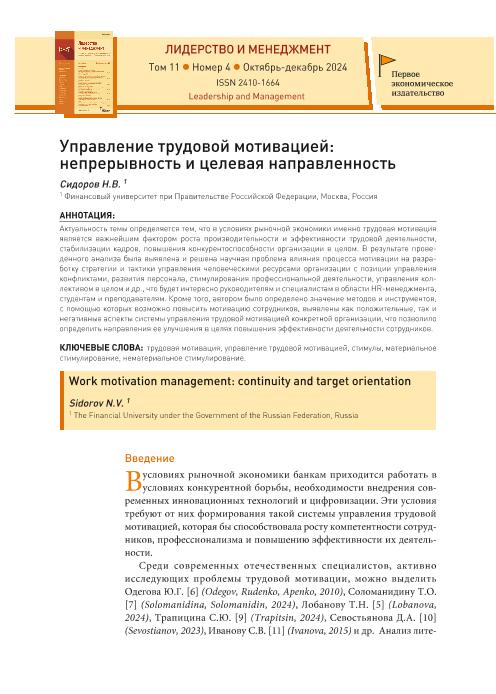 Сидоров, Н.В. Управление трудовой мотивацией: непрерывность и целевая направленность // Лидерство и менеджмент. – 2024. – № 4. — С. 1597-1606. — Только в электронном виде. — <URL:http://elib.fa.ru/art2024/bv3671.pdf>.