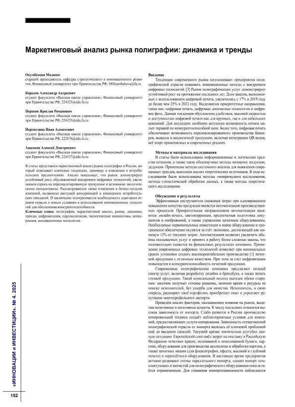 Маркетинговый анализ рынка полиграфии: динамика и тренды / М. Окумбекова, А.А. Королев, Я.Р. Першин [и др.] // Инновации и инвестиции. – 2025. – № 4. — С. 152-154. — Только в электронном виде. — <URL:http://elib.fa.ru/art2025/bv1676.pdf>.