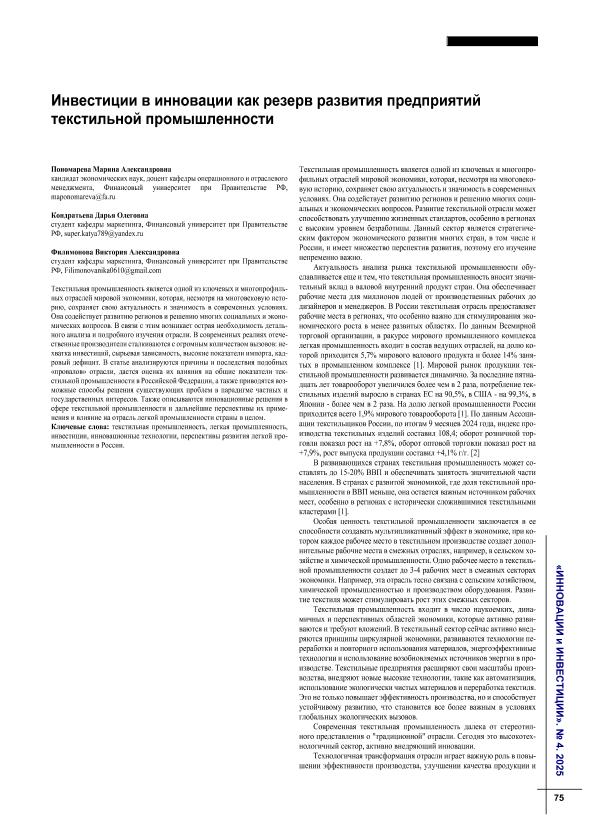 Пономарева, М.А. Инвестиции в инновации как резерв развития предприятий текстильной промышленности / М.А. Пономарева, Д.О. Кондратьева, В.А. Филимонова // Инновации и инвестиции. – 2025. – № 4. — С. 75-79. — Только в электронном виде. — <URL:http://elib.fa.ru/art2025/bv1682.pdf>.