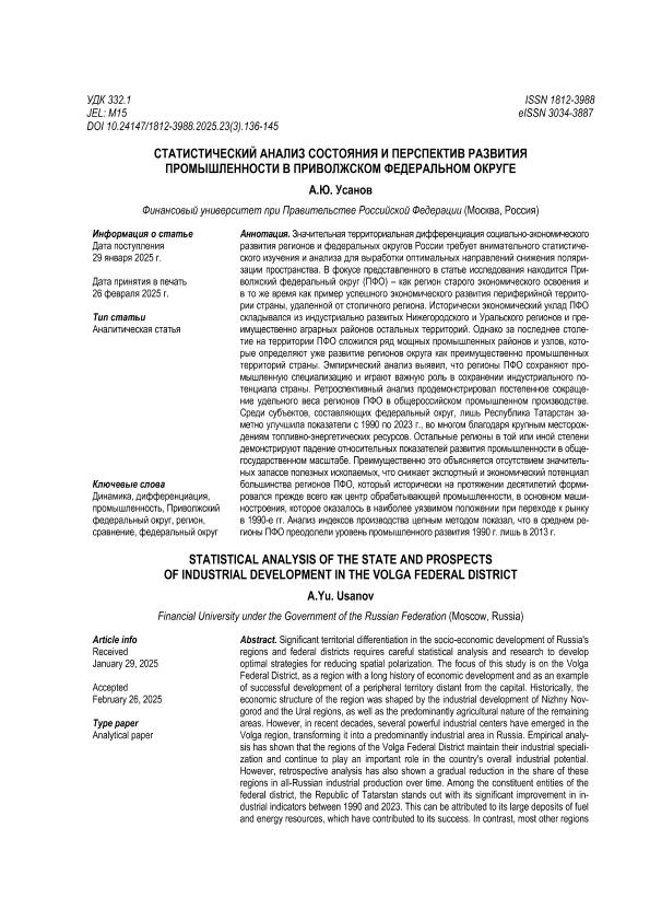 Усанов, А.Ю. Статистический анализ состояния и перспектив развития промышленности в Приволжском федеральном округе // Вестник Омского университета. Серия: Экономика. – 2025. – № 3. — С. 136-145. — Только в электронном виде. — <URL:http://elib.fa.ru/art2025/bv1692.pdf>.