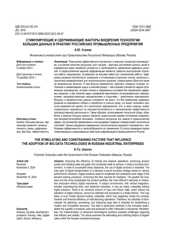 Усанов, А.Ю. Стимулирующие и сдерживающие факторы внедрения технологии больших данных в практику российских промышленных предприятий // Вестник Омского университета. Серия: Экономика. – 2025. – № 1. — С. 39-47. — Только в электронном виде. — <URL:http://elib.fa.ru/art2025/bv1693.pdf>.