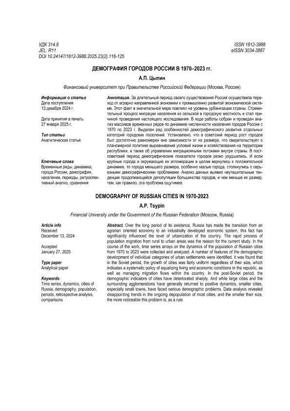 Цыпин, А.П. Демография городов России в 1970–2023 гг. // Вестник Омского университета. Серия: Экономика. – 2025. – № 2. — С. 116-125. — Только в электронном виде. — <URL:http://elib.fa.ru/art2025/bv1695.pdf>.