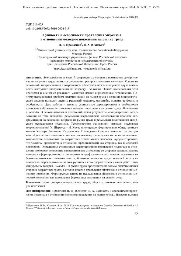 Проказина, Н.В. Сущность и особенности проявления эйджизма в отношении молодого поколения на рынке труда / Н.В. Проказина, Я.А. Юхневич // Известия высших учебных заведений. Поволжский регион. Общественные науки. – 2024. – № 3. — С. 55-70. — Только в электронном виде. — <URL:http://elib.fa.ru/art2024/bv3618.pdf>.