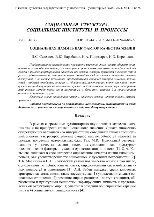 Социальная память как фактор качества жизни / П.С. Селезнев, В.Ю. Барабанов, Н.А. Пономарев, И.О. Кореньков // Известия Тульского государственного университета. Гуманитарные науки. – 2024. – № 4. — С. 88-97. — Только в электронном виде. — <URL:http://elib.fa.ru/art2024/bv3622.pdf>.