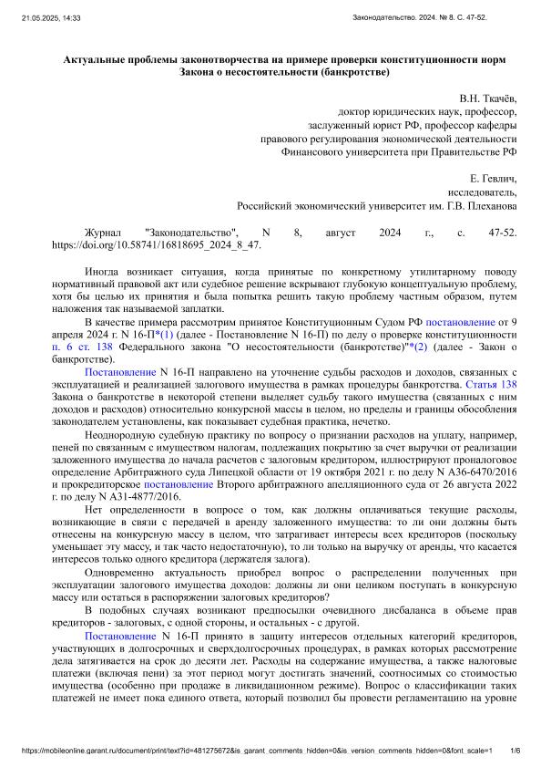Ткачев, В.Н. Актуальные проблемы законотворчества на примере проверки конституционности норм Закона о несостоятельности (банкротстве) / В.Н. Ткачев, Е. Гевлич // Законодательство. – 2024. – № 8. — С. 47-52. — Только в электронном виде. — <URL:http://elib.fa.ru/art2024/bv3626.pdf>.