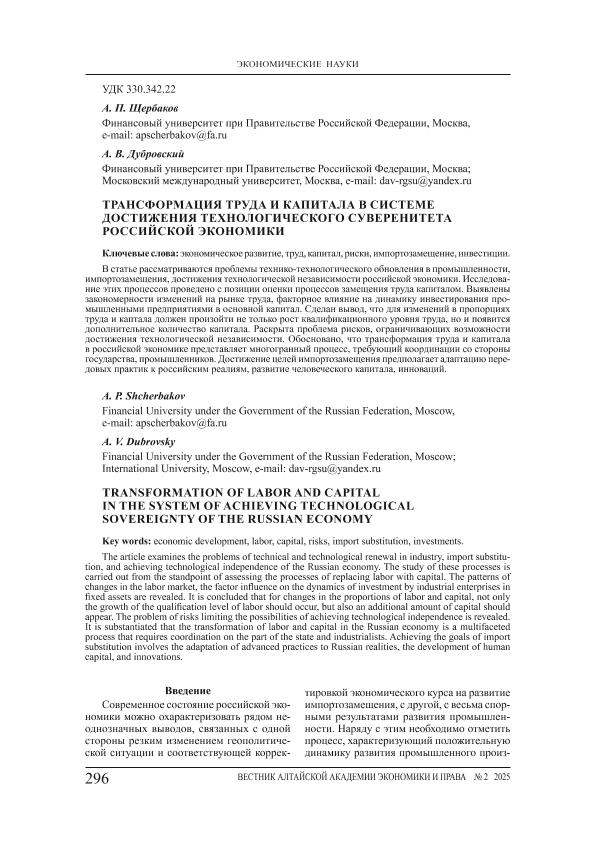 Щербаков, А.П. Трансформация труда и капитала в системе достижения технологического суверенитета российской экономики / А.П. Щербаков, А.В. Дубровский // Вестник Алтайской академии экономики и права. – 2025. – № 2-2. — С. 296-301. — Только в электронном виде. — <URL:http://elib.fa.ru/art2025/bv1635.pdf>.