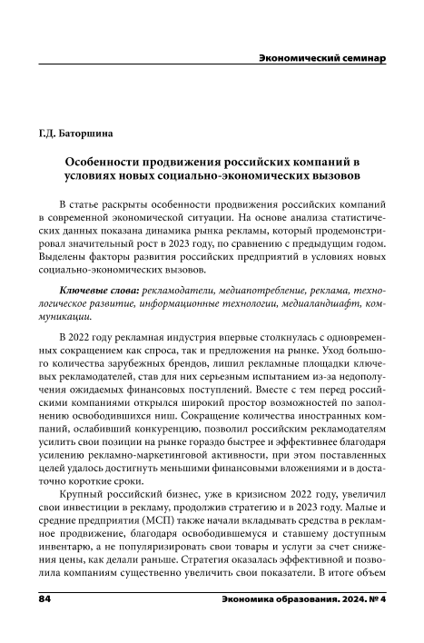 Баторшина, Г.Д. Особенности продвижения российских компаний в условиях новых социально-экономических вызовов // Экономика образования. – 2024. – № 4. — С. 84-94 — <URL:http://elib.fa.ru/art2024/bv3924.pdf>.