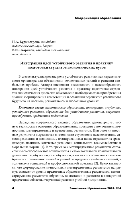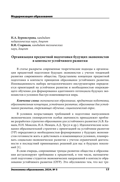 Бурмистрова, Н.А. Организация предметной подготовки будущих экономистов в контексте устойчивого развития / Н.А. Бурмистрова, В.И. Стариков // Экономика образования. – 2024. – № 5. — С. 17-26 — <URL:http://elib.fa.ru/art2024/bv3928.pdf>.