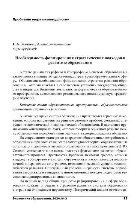 Завалько, Н.А. Необходимость формирования стратегических подходов к развитию образования // Экономика образования. – 2024. – № 3. — С. 13-20 — <URL:http://elib.fa.ru/art2024/bv3938.pdf>.