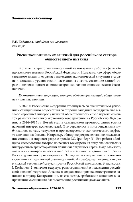 Кабанова, Е.Е. Риски экономических санкций для российского сектора общественного питания // Экономика образования. – 2024. – № 3. — С. 113-125 — <URL:http://elib.fa.ru/art2024/bv3943.pdf>.