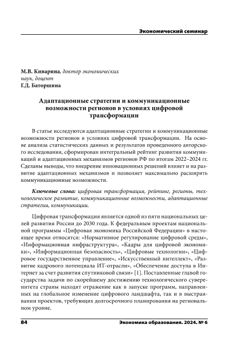 Киварина, М.В. Адаптационные стратегии и коммуникационные возможности регионов в условиях цифровой трансформации / М.В. Киварина, Г.Д. Баторшина // Экономика образования. – 2024. – № 6. — С. 84-97 — <URL:http://elib.fa.ru/art2024/bv3945.pdf>.
