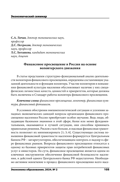 Лочан, С.А. Финансовое просвещение в России на основе волонтерского движения / С.А. Лочан, Д.С. Петросян, Л.С. Боташева // Экономика образования. – 2024. – № 2. — С. 105-116 — <URL:http://elib.fa.ru/art2024/bv3953.pdf>.