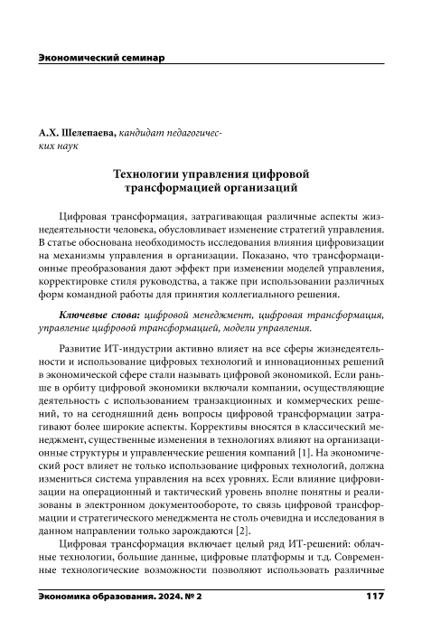 Шелепаева, А.Х. Технологии управления цифровой трансформацией организаций // Экономика образования. – 2024. – № 2. — С. 117-124 — <URL:http://elib.fa.ru/art2024/bv3988.pdf>.