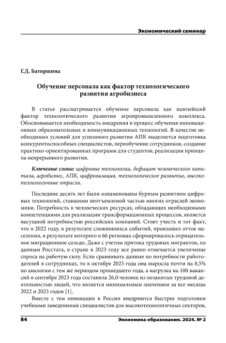 Баторшина, Г.Д. Обучение персонала как фактор технологического развития агробизнеса // Экономика образования. – 2024. – № 2. — С. 84-94 — <URL:http://elib.fa.ru/art2024/bv3923.pdf>.