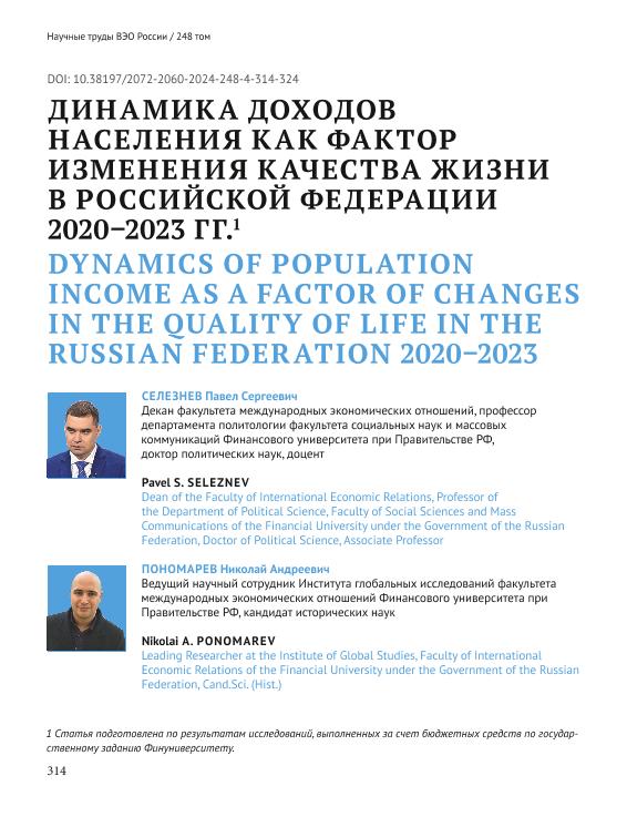 Селезнев, П.С. Динамика доходов населения как фактор изменения качества жизни в Российской Федерации 2020-2023 гг. / П.С. Селезнев, Н.А. Пономарев // Научные труды Вольного экономического общества России. – 2024. – Т. 248. — С. 314-324. — Только в электронном виде. — <URL:http://elib.fa.ru/art2024/bv3879.pdf>.